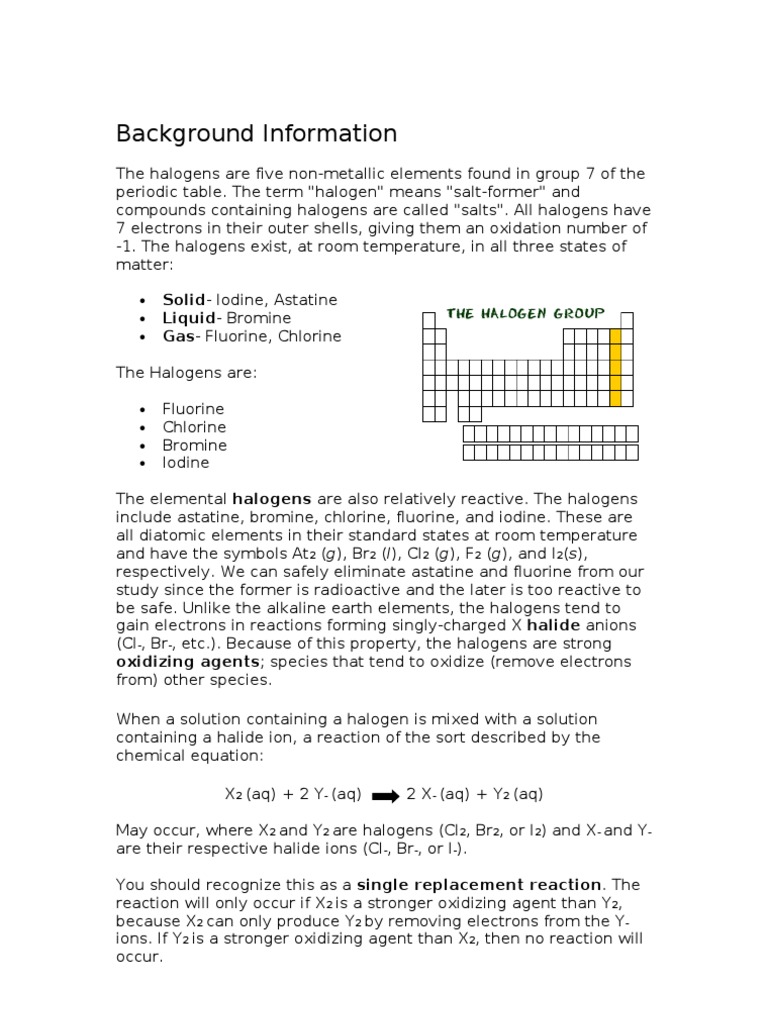 It is the lightest halogen and exists as a highly toxic pale yellow diatomic gas at standard conditions as the most electronegative element it is extremely reactive as it reacts with all other elements except for argon neon and helium.
